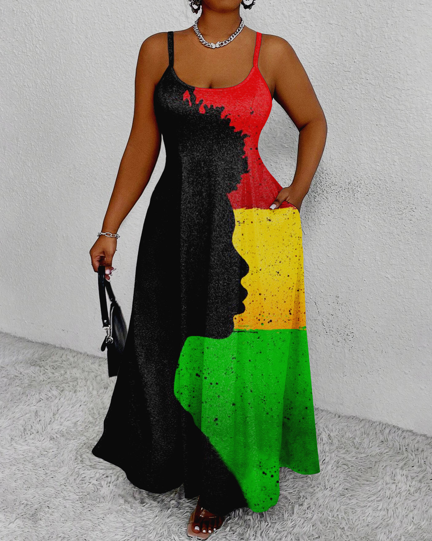 Afro messy bun Juneteenth Print Suspenders Maxi Dress