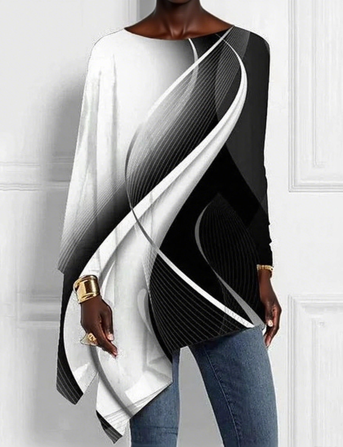 Black and White Geometric Waves Long Sleeve Loose Hem Top
