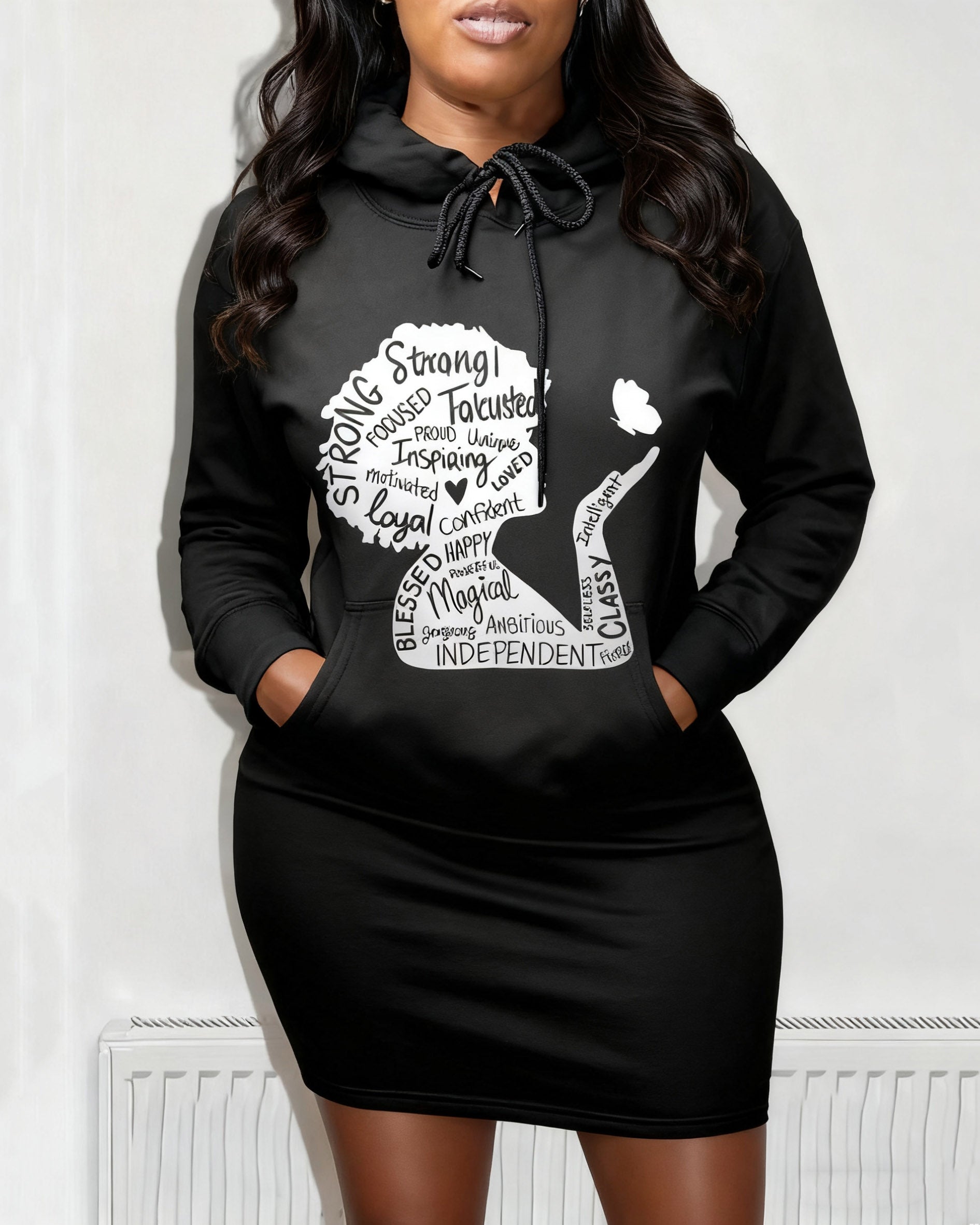 Black Girl Magic Pocket Drawstring Long Sleeve Hoodie Dress