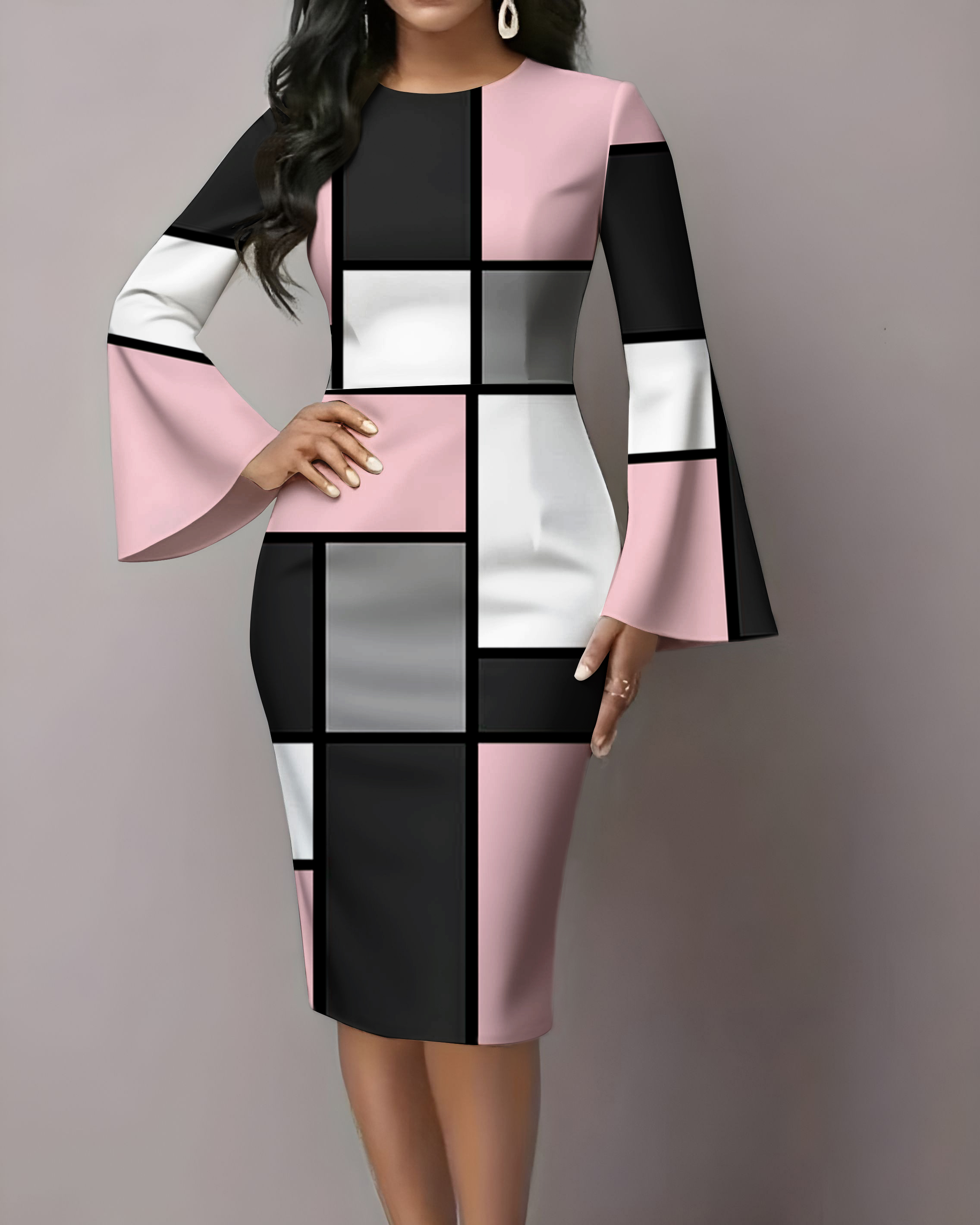 Contrast Color Geometric Plaid Flared Sleeves Midi Bodycon Dresses