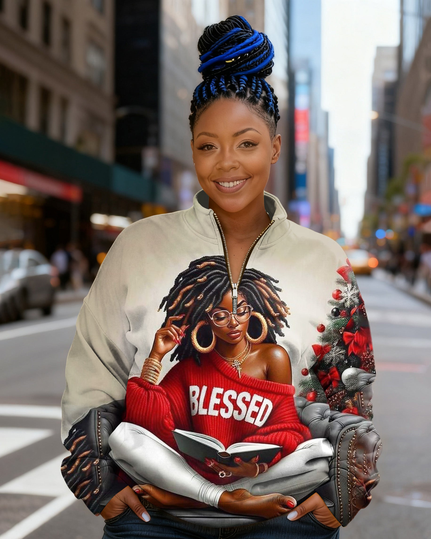 Curly-haired Reading Girl Stand Collar Zip Up Long Sleeve Sweatshirt