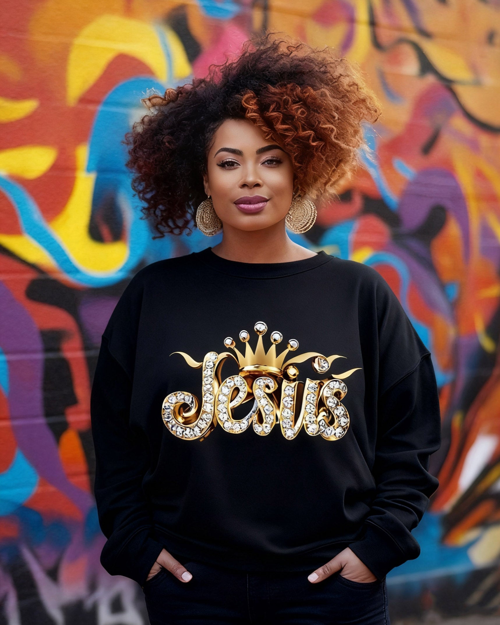 Diamond Color Jesus Letters Print Crewneck Long Sleeve Sweatshirt