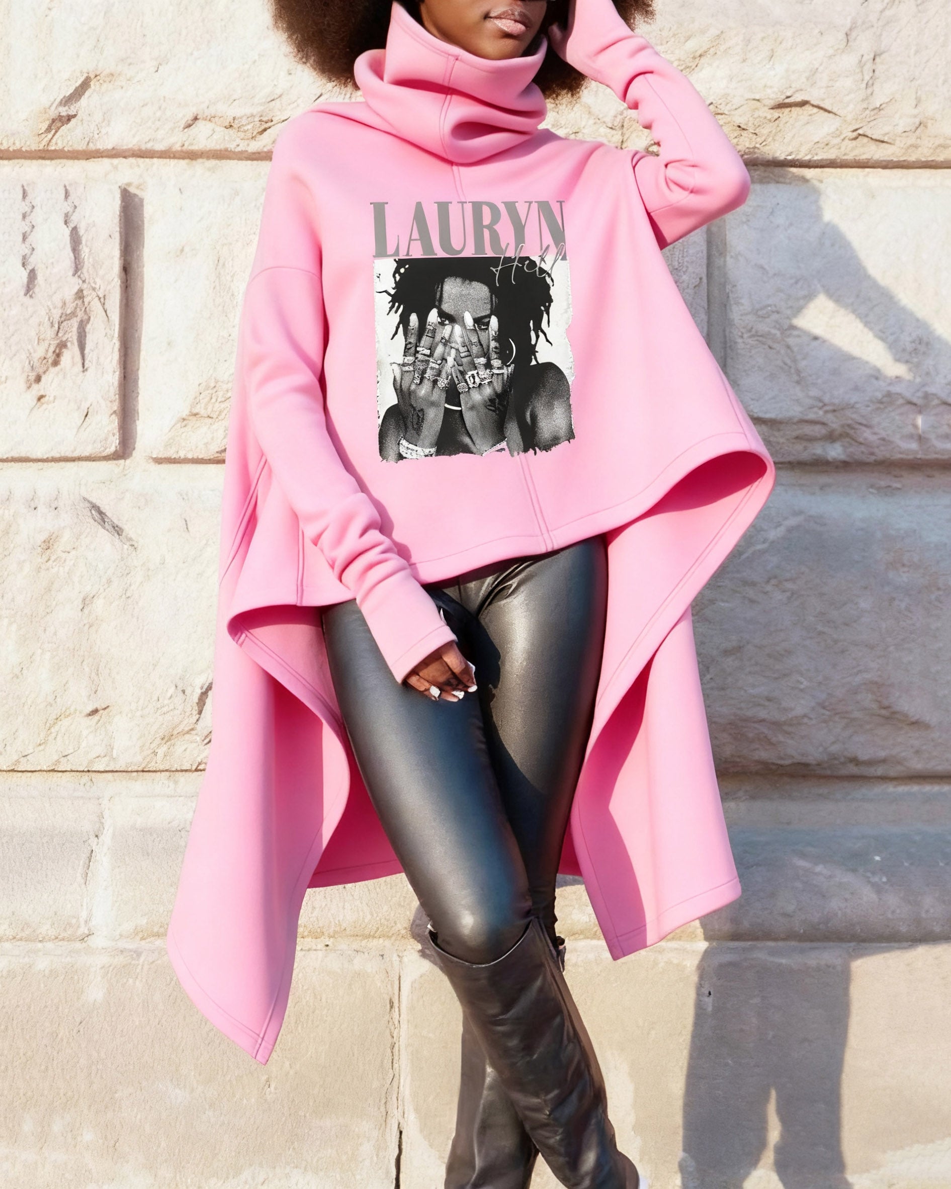 High Collar Pullover Lauren Hill Pink Irregular Long Sleeve Warm Sweatshirt