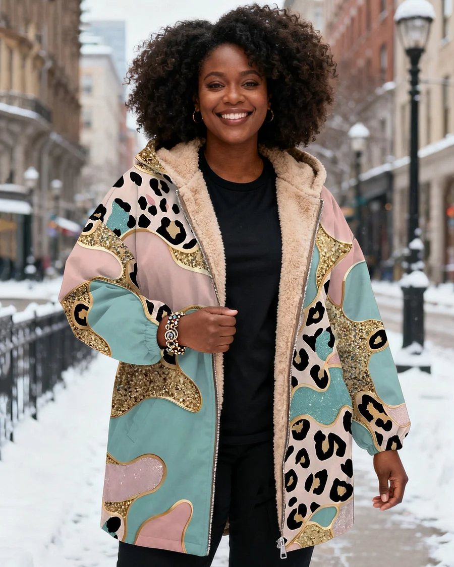 Leopard Wave Contrast Long Sleeve Zip-Up Fleece Long Hoodies