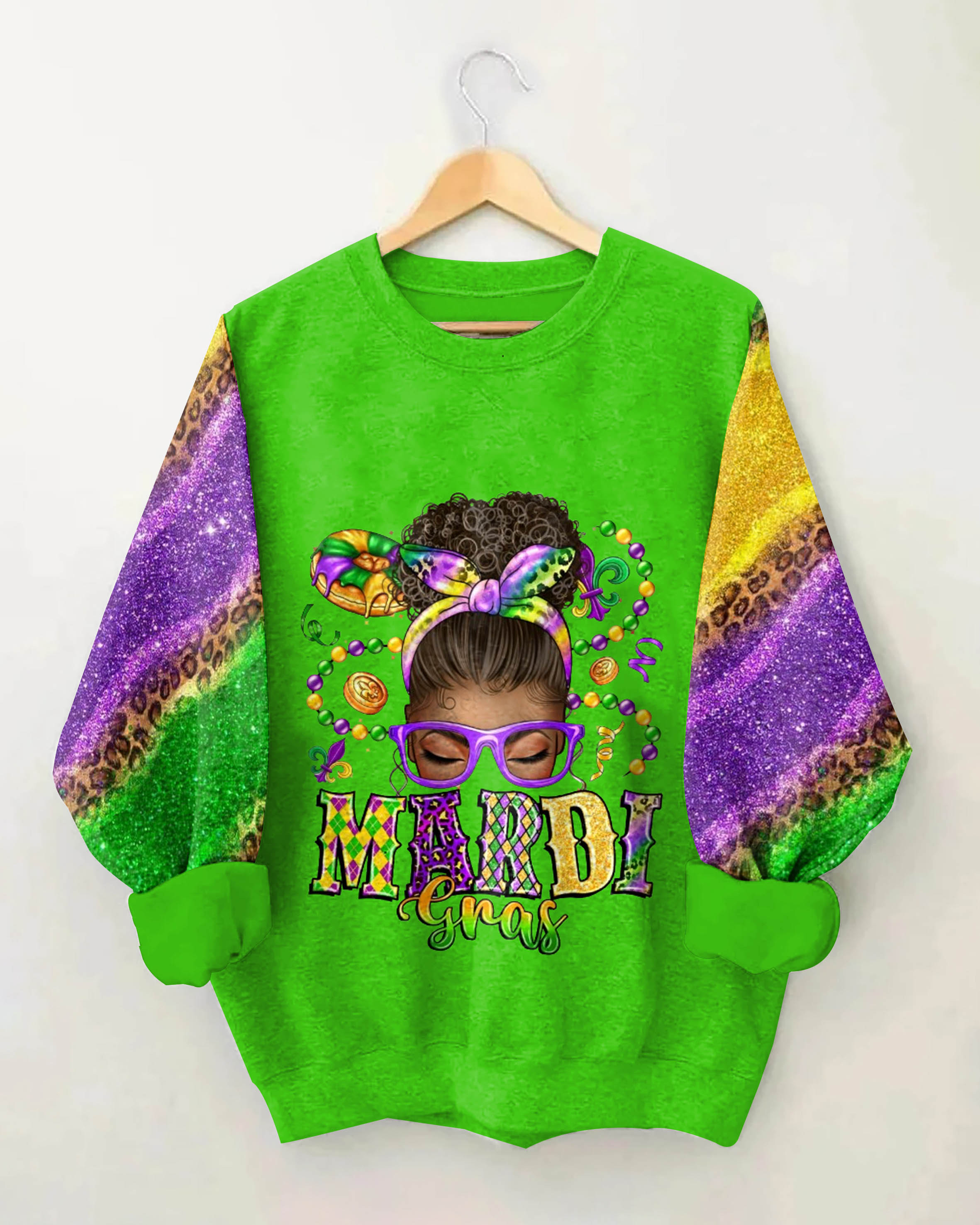 Mardi Gras Afro Messy Bun Crewneck Sweatshirt