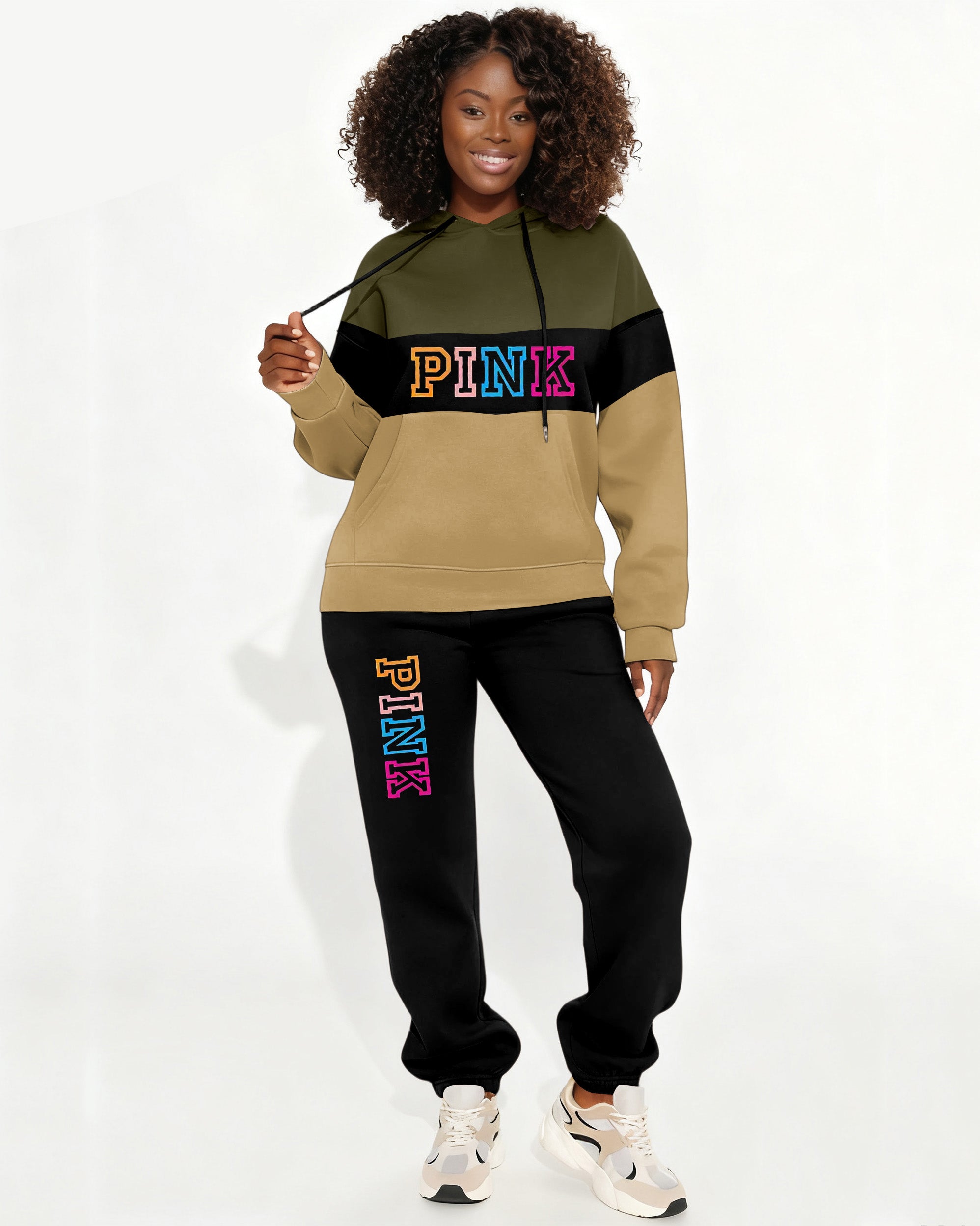 PINK Stripe Contrast Hooded Two Pieces Set