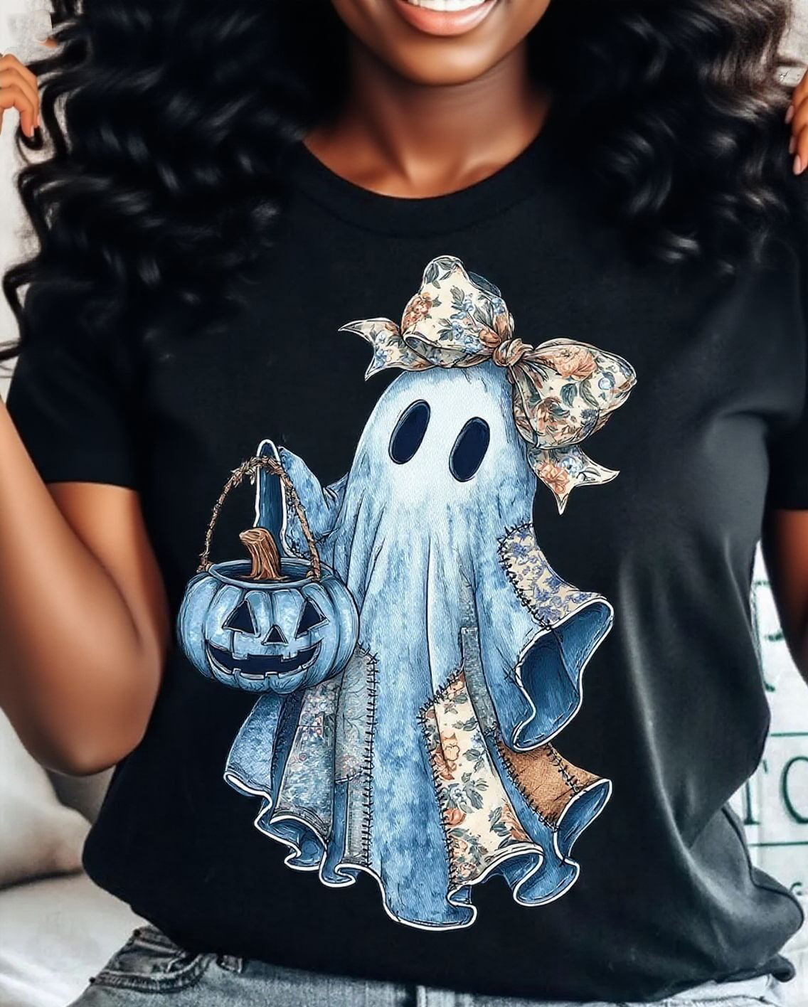Retro Halloween Blue Denim Ghost 100% Cotton Crew Neck Short Sleeve Tshirt