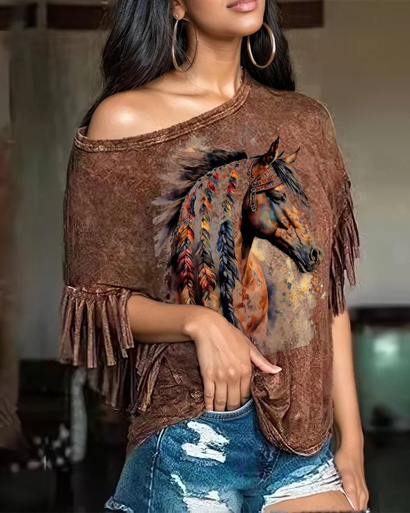 Retro Western Style Colored Horse Print Loose Tassel Casual T-shirt