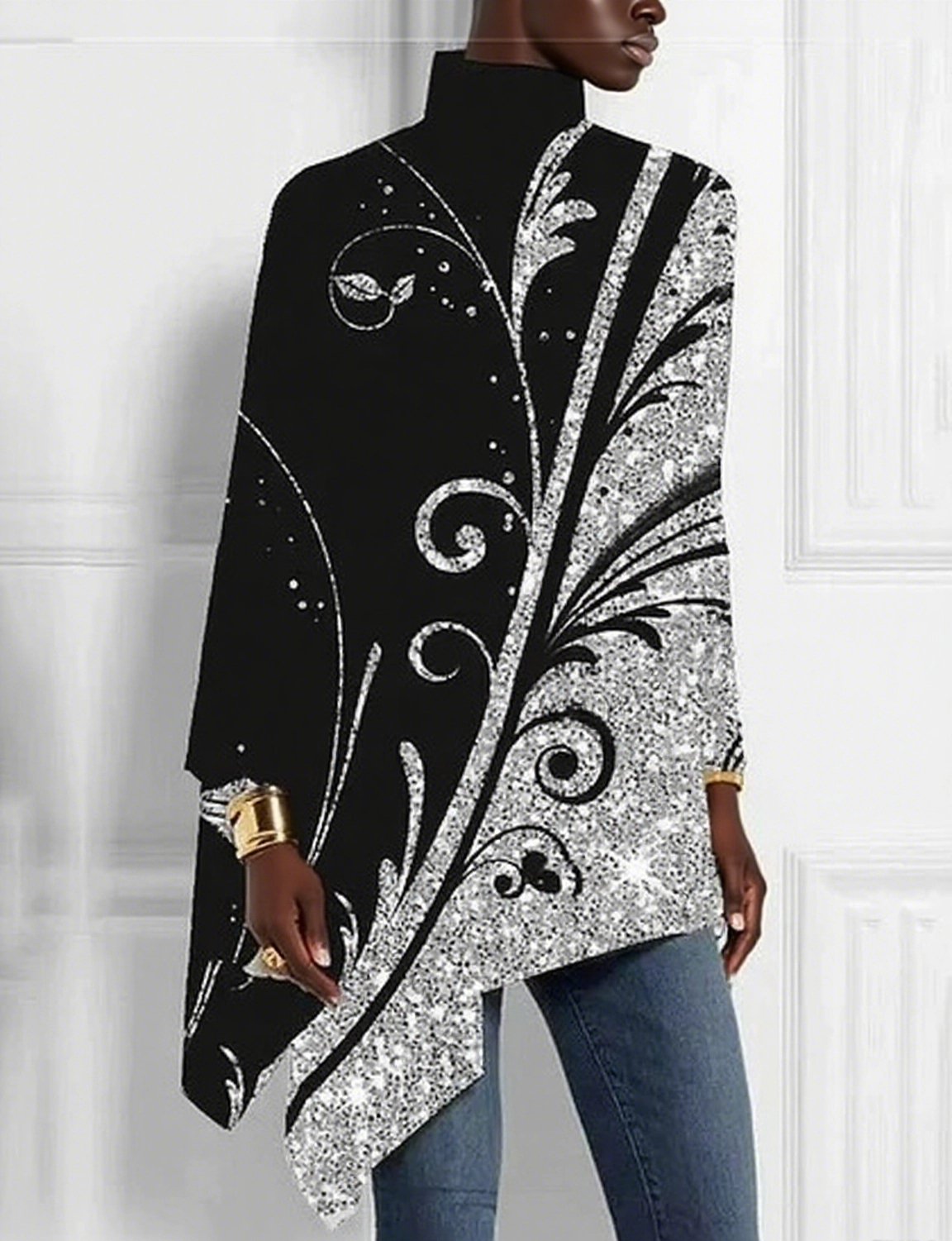 Sequined Floral Patchwork Half Turtleneck Hem Top
