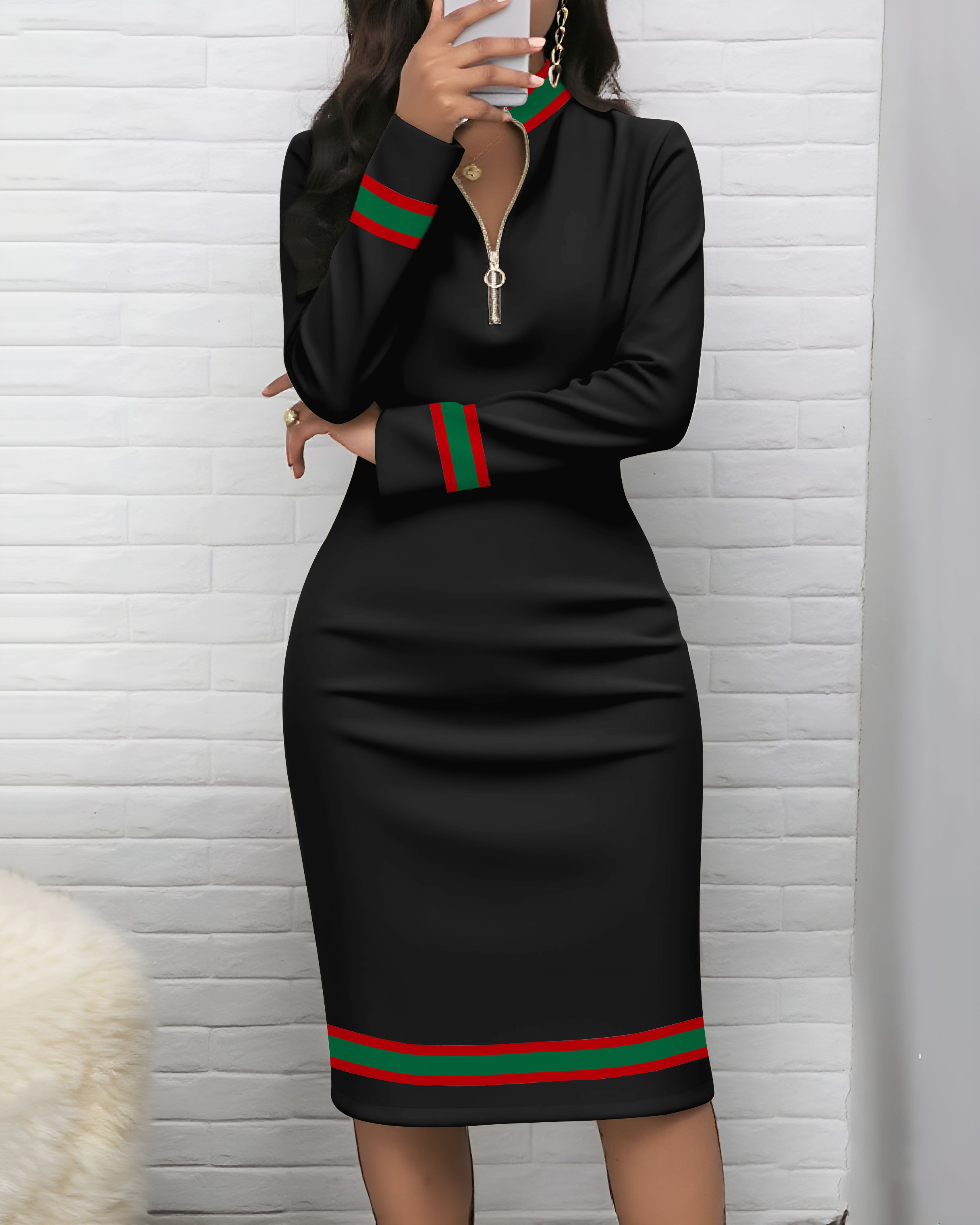 Simple Striped Zipper Stand Collar Long Sleeve Bodycon Dress