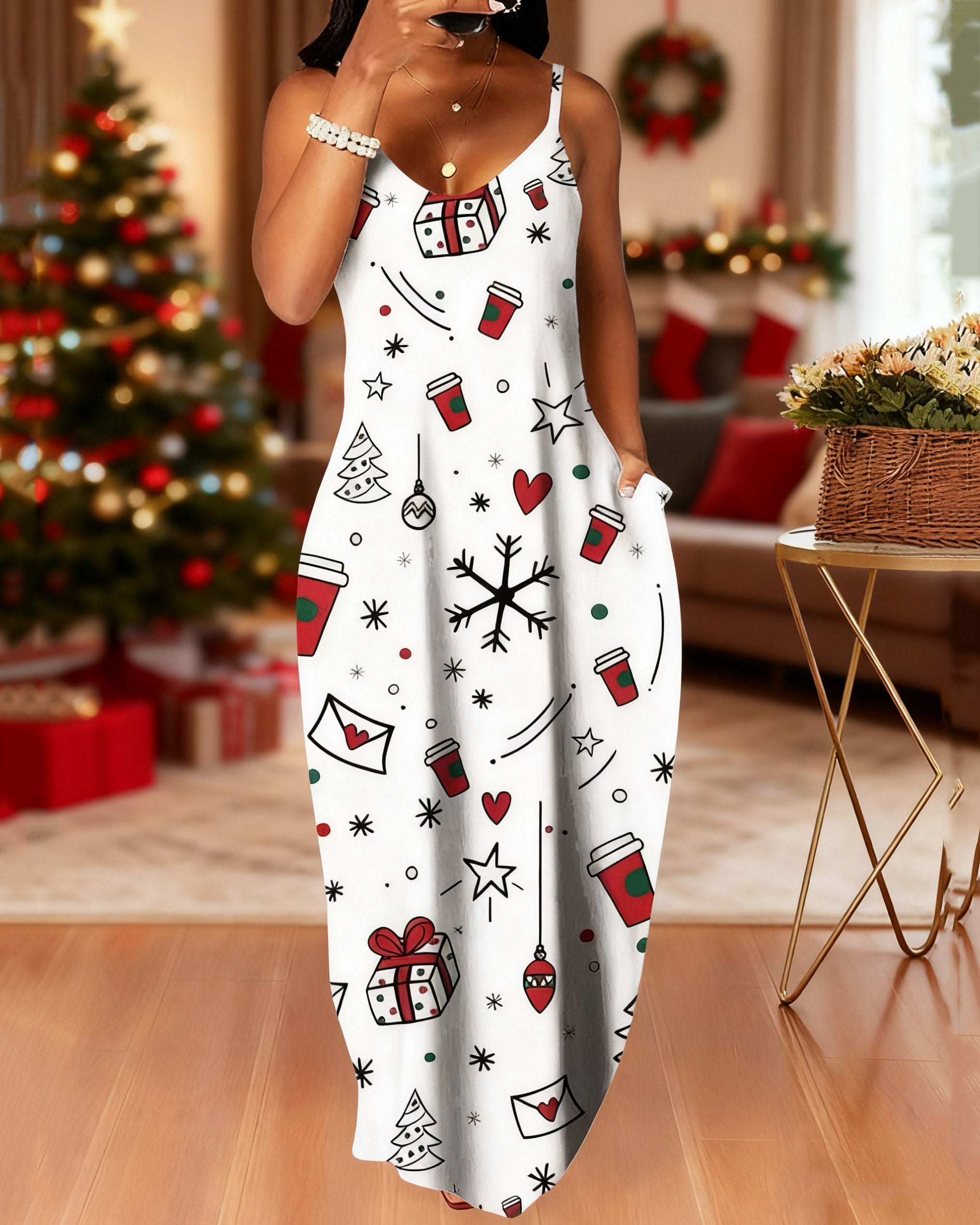 Sling Christmas Fun Gift Prints Pocket Maxi Dress